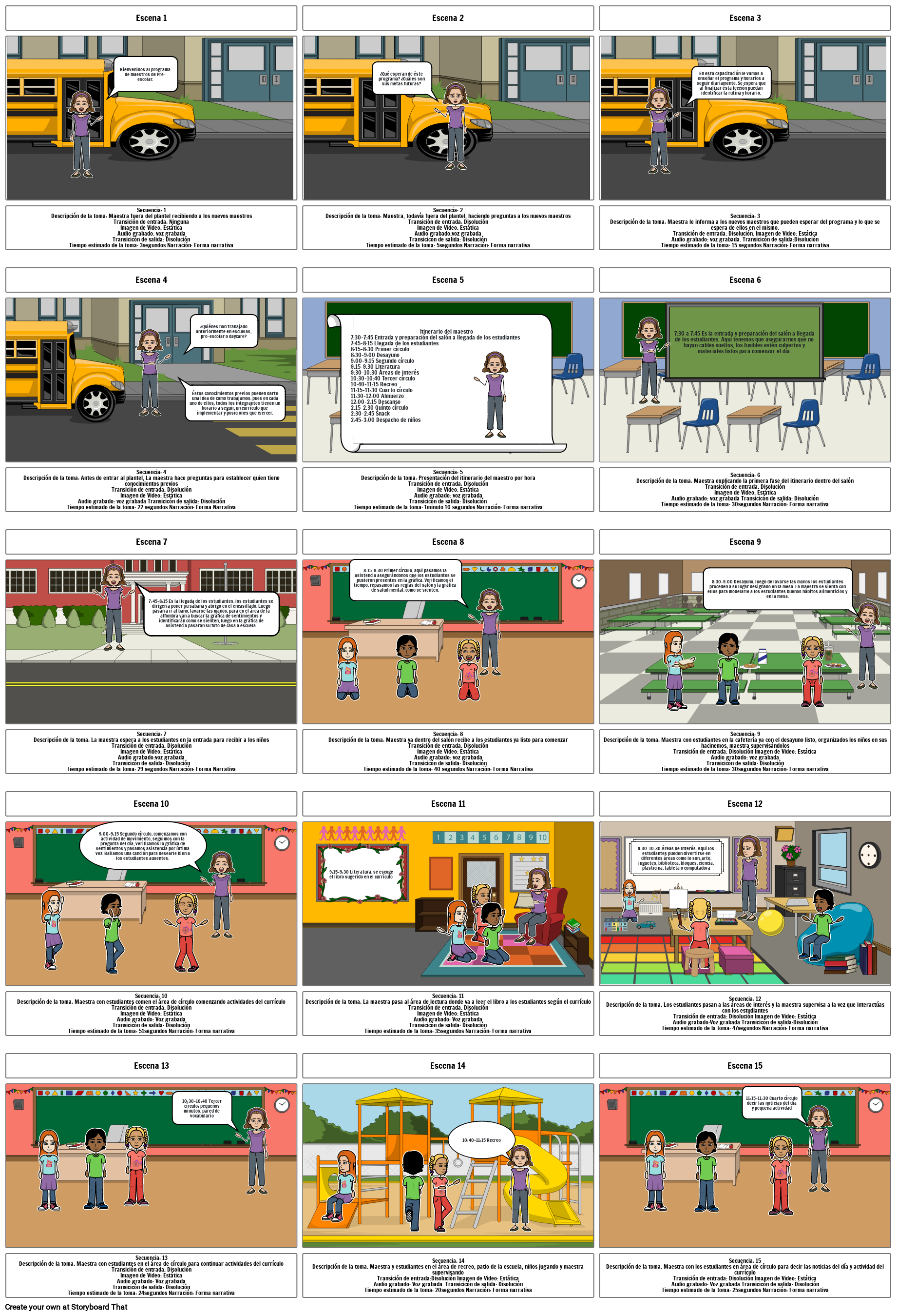 Secuencia: 10Descripción de la toma: Maestra con estudiantes comen el área de círculo comenzando actividades del currículoTransición de entrada: DisoluciónImagen de Video: EstáticaAudio grabado: Voz grabadaTransicicón de salida: DisoluciónTiempo estimado de la toma: 51segundos Narración: Forma narrativa