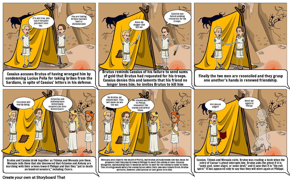Cassius accuses Brutus of having wronged him by condemning Lucius Pella for taking bribes from the Sardians, in spite of Cassius' letters in his defense.