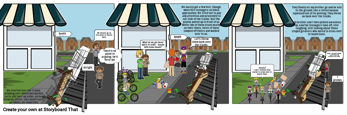 They finally let my brother go and he slid to the ground, like a rotten banana squeezed out of its peeling. They threw us back over the tracks.My brother and I then picked ourselves up, saw the teenagers take off, still laughing, still talking about those stupid greasers who dared to cross over to South Gate.