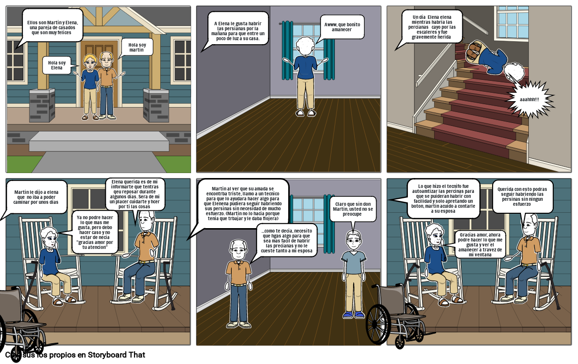 Martin al ver que su amada se encontrba triste, llamo a un tecnico para que lo ayudara hacer algo para que Elenena pudiera seguir habriendo sus persinas sin necesidad de mucho esfuerzo. (Martin no lo hacia porque tenia que trbajar y le daba flojera)