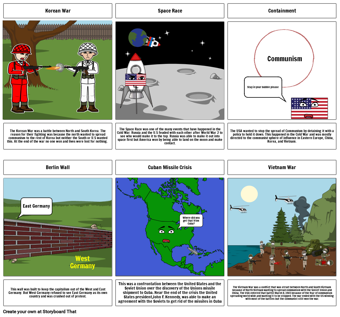 The Vietnam War was a conflict that was struct between North and South Vietnam because of North Vietnam wanting to spread communism with the Soviet Union and China. The USA entered that battle March 8, 1965 because of the fear of communism spreading world wide and wanting it to be stopped. The war ended with the US winning with most of the battles but the communist still won the war.
