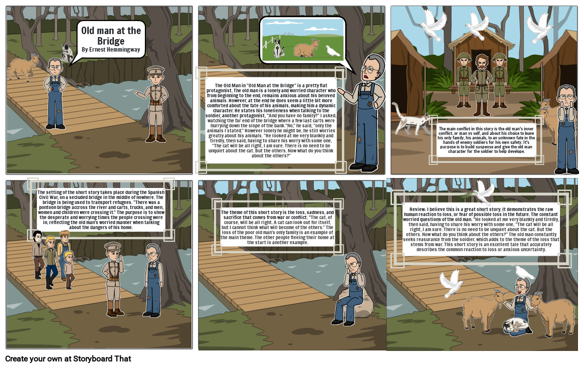 The Old Man in Old Man at the Bridge is a pretty flat protagonist. The old man is a lonely and worried character who from beginning to the end, remains anxious about his beloved animals. However, at the end he does seem a little bit more comforted about the fate of his animals, making him a dynamic character. He states his lonelieness when talking to the soldier, another protagonist, And you have no family?” I asked, watching the far end of the bridge where a few last carts were hurrying down the slope of the bank.“No,” he said, “only the animals I stated. However lonely he might be, he still worries greatly about his animals. He looked at me very blankly and tiredly, then said, having to share his worry with some one, “The cat will be all right, I am sure. There is no need to be unquiet about the cat. But the others. Now what do you think about the others?”
