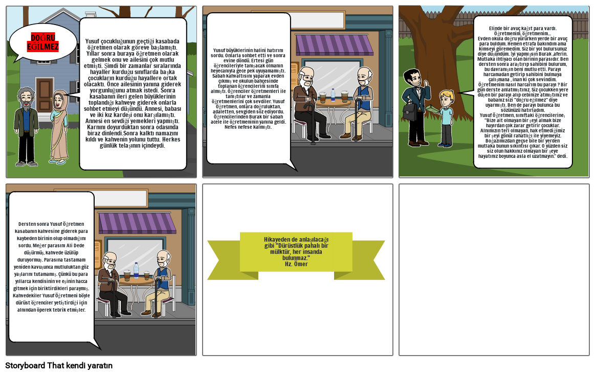 Elinde bir avuç kağıt para vardı. Öğretmenim, öğretmenim...Evden okula doğru yürürken yerde bir avuç para buldum. Hemen etrafa bakındım ama kimseyi göremedim. Siz bir yol bulursunuz diye düşündüm. İyi yapmışsın Burak ,aferin. Mutlaka ihtiyacı olan birinin parasıdır. Ben dersten sonra araştırıp sahibini bulurum, bu davranışın beni mutlu etti. Parayı harcamadan getirip sahibini bulmaya çalışmana , inan ki çok sevindim. Öğretmenim nasıl harcarım bu parayı ? Bir gün derste anlatmıştınız. Siz çocukken yere düşen bir parayı alıp cebinize atmıştınız ve babanız sizi ''doğru eğilmez'' diye uyarmıştı. Ben de parayı bulunca bu sözünüzü hatırladım.Yusuf Öğretmen, sınıftaki öğrencilerine; ''Bize ait olmayan bir şeyi almak bize hayırdan çok zarar getirir çocuklar. Alnımızın teri olmayan, hak etmediğimiz bir şeyi gönül rahatlığı ile yiyemeyiz. Boğazımızdan geçse bile bir yerden mutlaka bunun sıkıntısı çıkar. O yüzden siz siz olun hakkınız olmayan bir şeye hayatınız boyunca asla el uzatmayın.'' dedi.