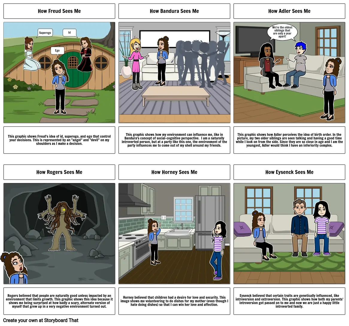 Rogers believed that people are naturally good unless impacted by an environment that limits growth. This graphic shows this idea because it shows me being surprised at how badly a scary, alternate version of myself that grew up in a very negative environment turned out.