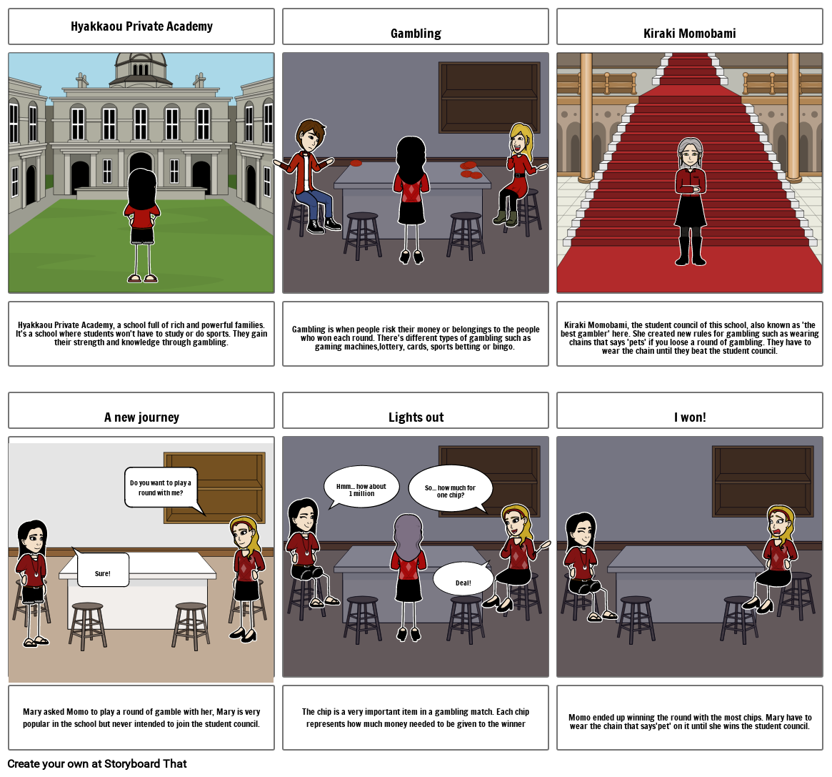 Kiraki Momobami, the student council of this school, also known as 'the best gambler' here. She created new rules for gambling such as wearing chains that says 'pets' if you loose a round of gambling. They have to wear the chain until they beat the student council.