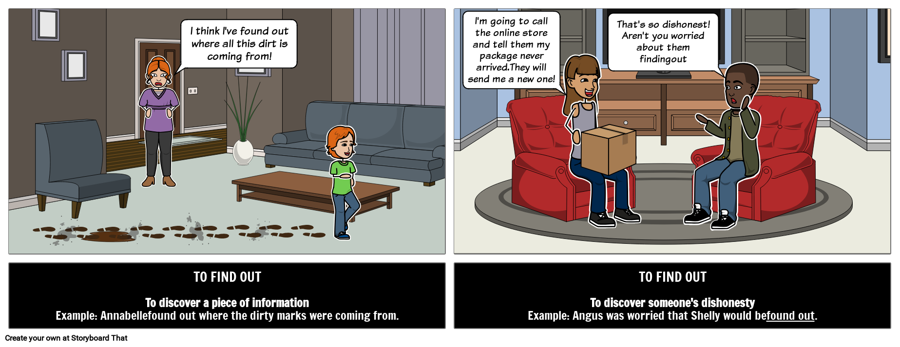 TO FIND OUTTo discover a piece of informationExample: Annabellefound out where the dirty marks were coming from.