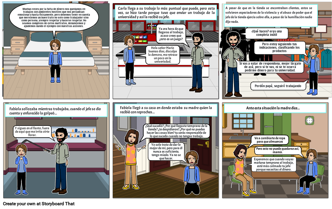 Muchas veces por la falta de dinero nos quedamos en trabajos con ambientes hostiles que nos perjudican emocional y hasta físicamente, pero debemos tener en cuenta que merecemos un buen trato no solo como trabajador sino como persona, siempre respetar y hacerse respetar. No seamos complices de estos maltratos, denunciemos y ayudemos dando el ejemplo con nuestras acciones.