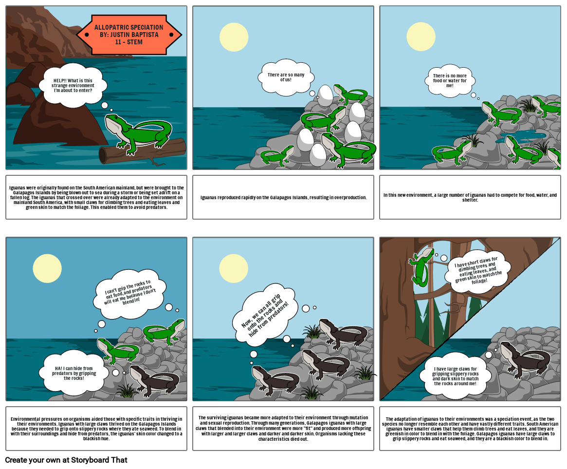 The adaptation of iguanas to their environments was a speciation event, as the two species no longer resemble each other and have vastly different traits. South American iguanas have smaller claws that help them climb trees and eat leaves, and they are greenish in color to blend in with the foliage. Galapagos iguanas have large claws to grip slippery rocks and eat seaweed, and they are a blackish color to blend in.