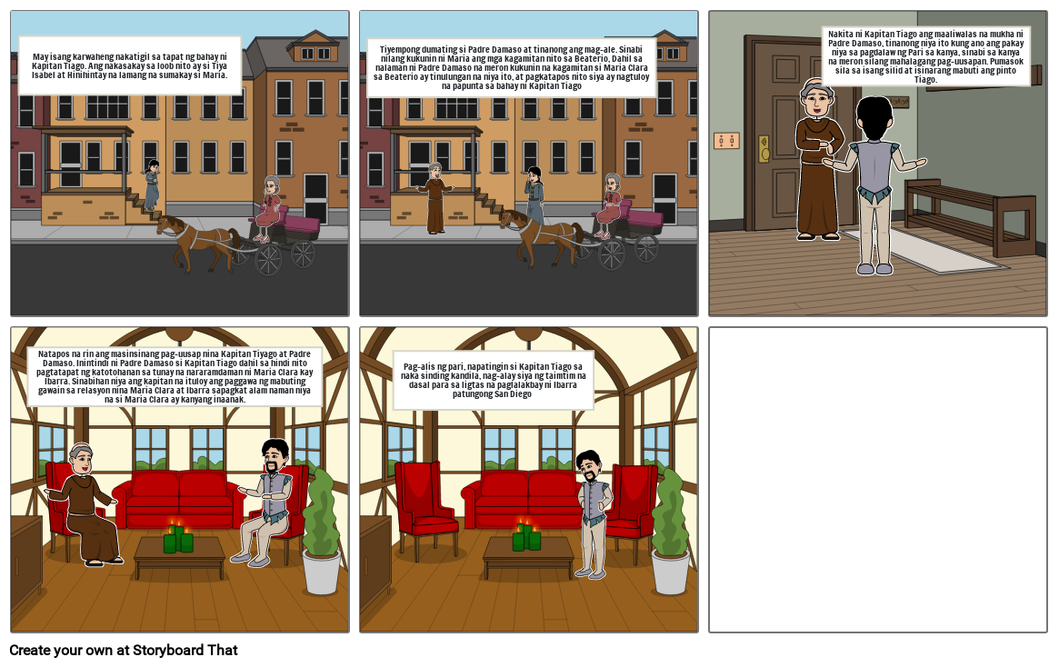 May isang karwaheng nakatigil sa tapat ng bahay ni Kapitan Tiago. Ang nakasakay sa loob nito ay si Tiya Isabel at Hinihintay na lamang na sumakay si Maria.