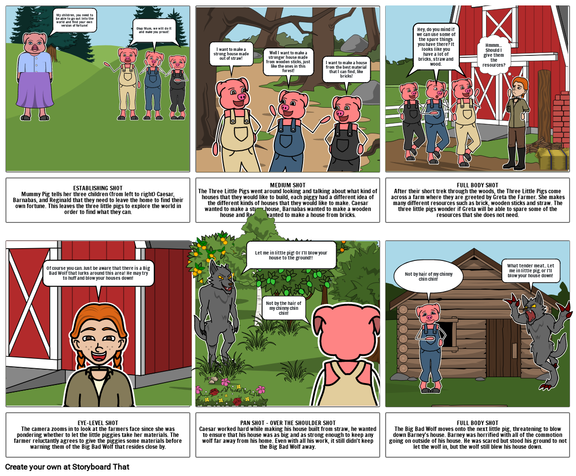 EYE-LEVEL SHOTThe camera zooms in to look at the farmers face since she was pondering whether to let the little piggies take her materials. The farmer reluctantly agrees to give the piggies some materials before warning them of the Big Bad Wolf that resides close by.