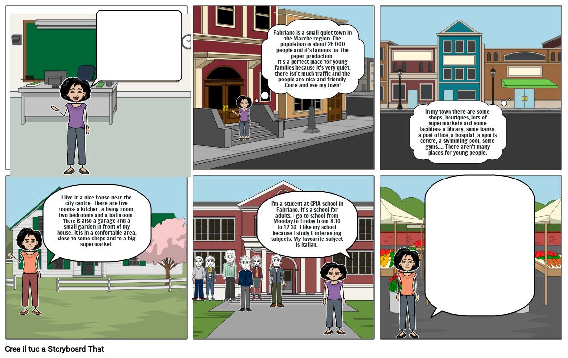 I'm a student at CPIA school in Fabriano. It's a school for adults. I go to school from Monday to Friday from 8.30 to 12.30. I like my school because I study 6 interesting subjects. My favourite subject is Italian.