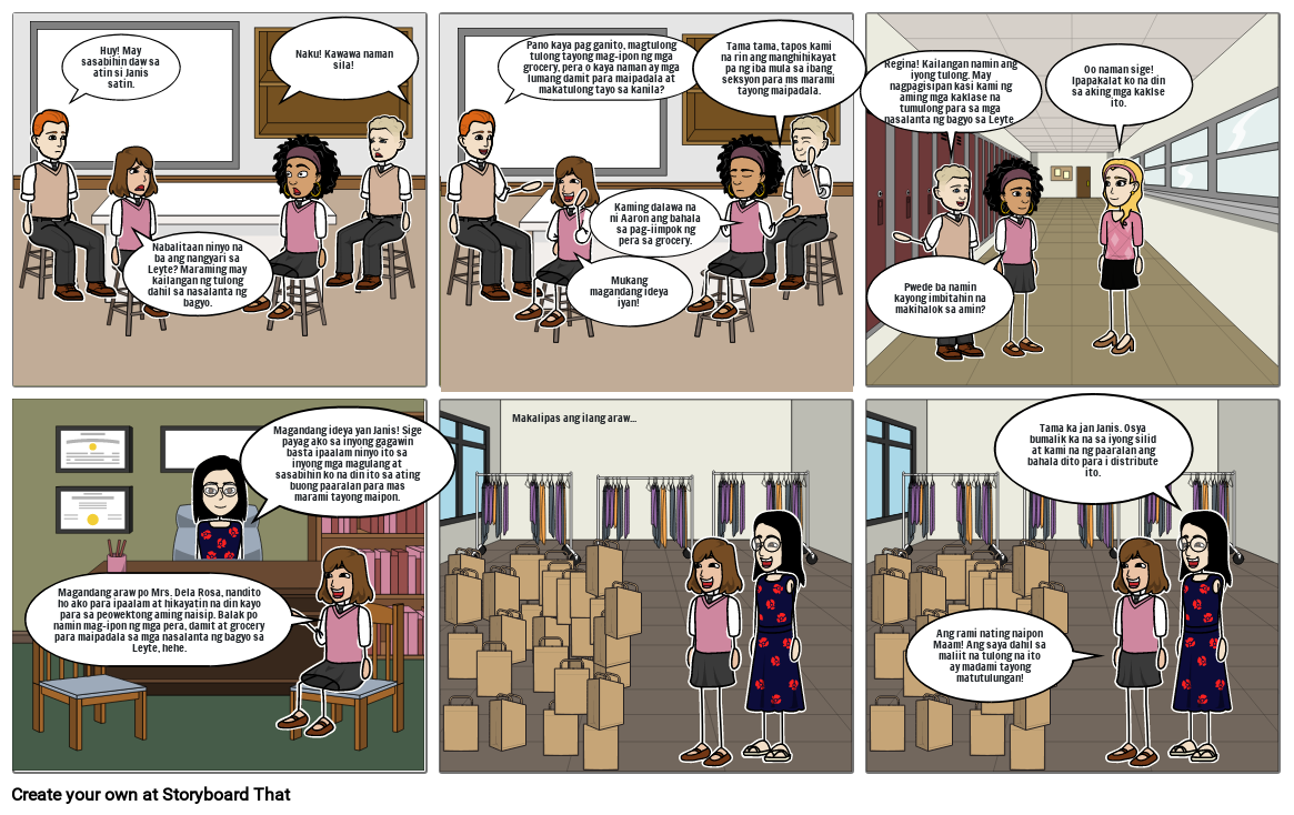 Magandang araw po Mrs. Dela Rosa, nandito ho ako para ipaalam at hikayatin na din kayo para sa peowektong aming naisip. Balak po namin mag-ipon ng mga pera, damit at grocery para maipadala sa mga nasalanta ng bagyo sa Leyte, hehe.