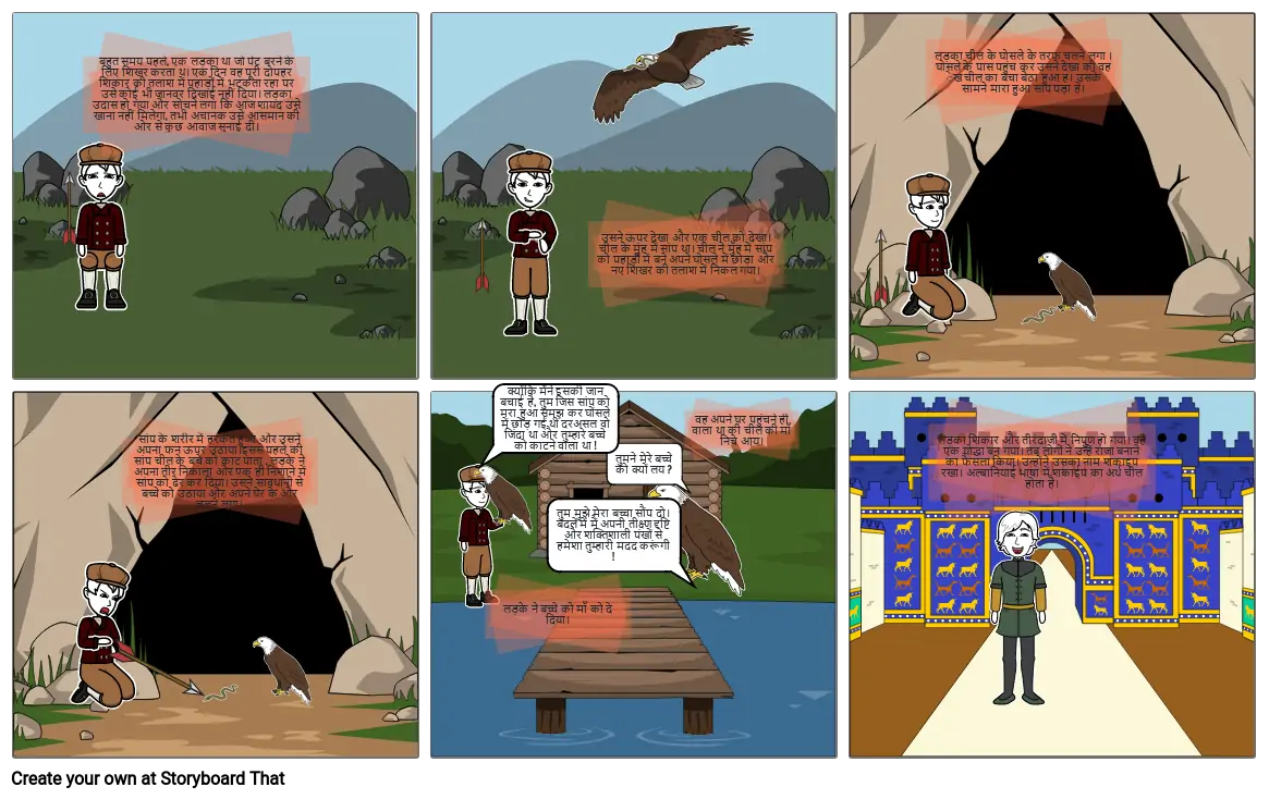 सांप के शरीर में हरकत हुआ और उसने अपना फन ऊपर उठाया।इससे पहले की सांप चील के बचे को काट पाता , लड़के ने अपना तीर निकाला और एक ही निशाने में सांप को ढेर कर दिया। उसने सावधानी से बच्चे को उठाया और अपने घेर के और चलने लगा।