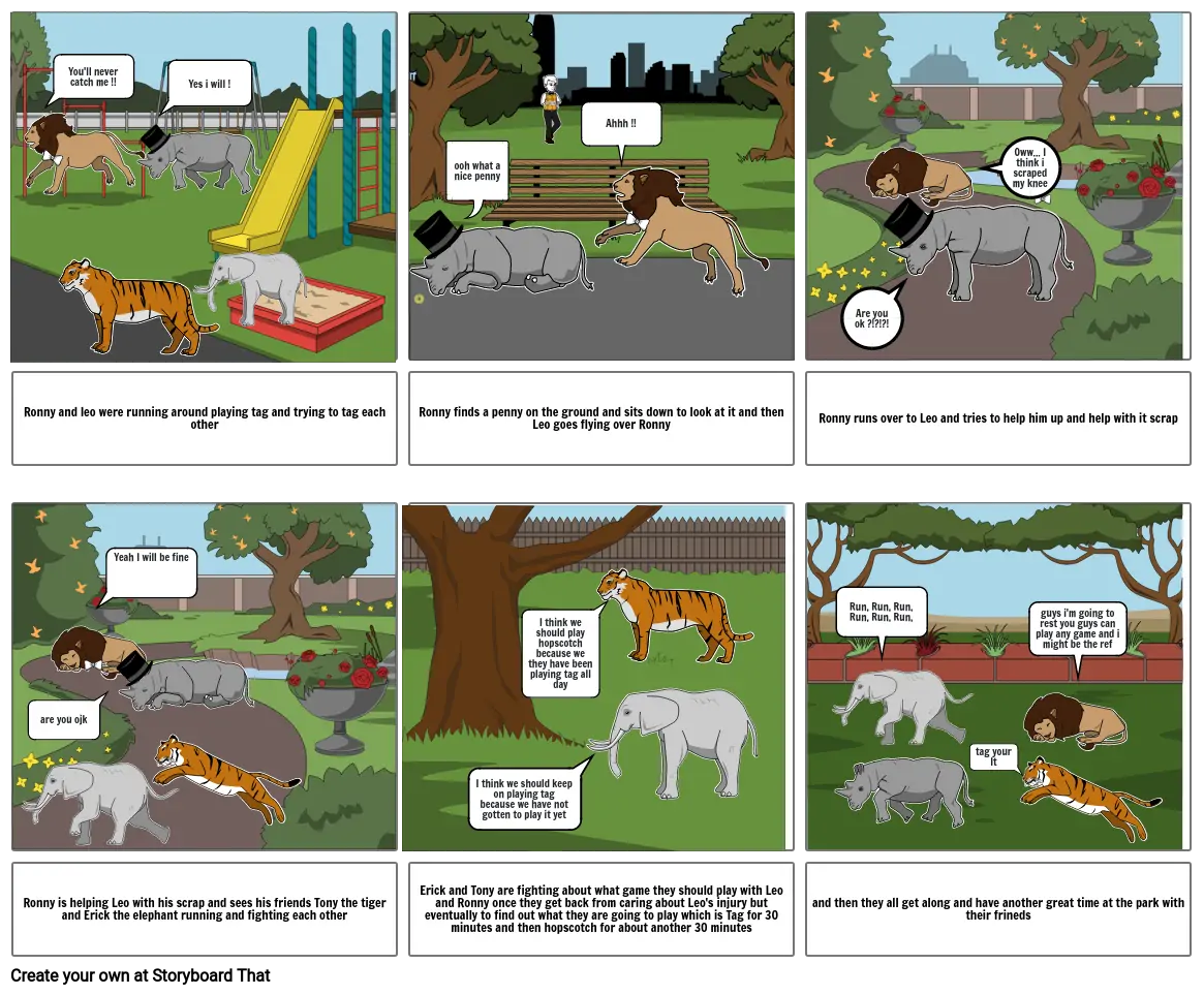 Ronny is helping Leo with his scrap and sees his friends Tony the tiger and Erick the elephant running and fighting each other