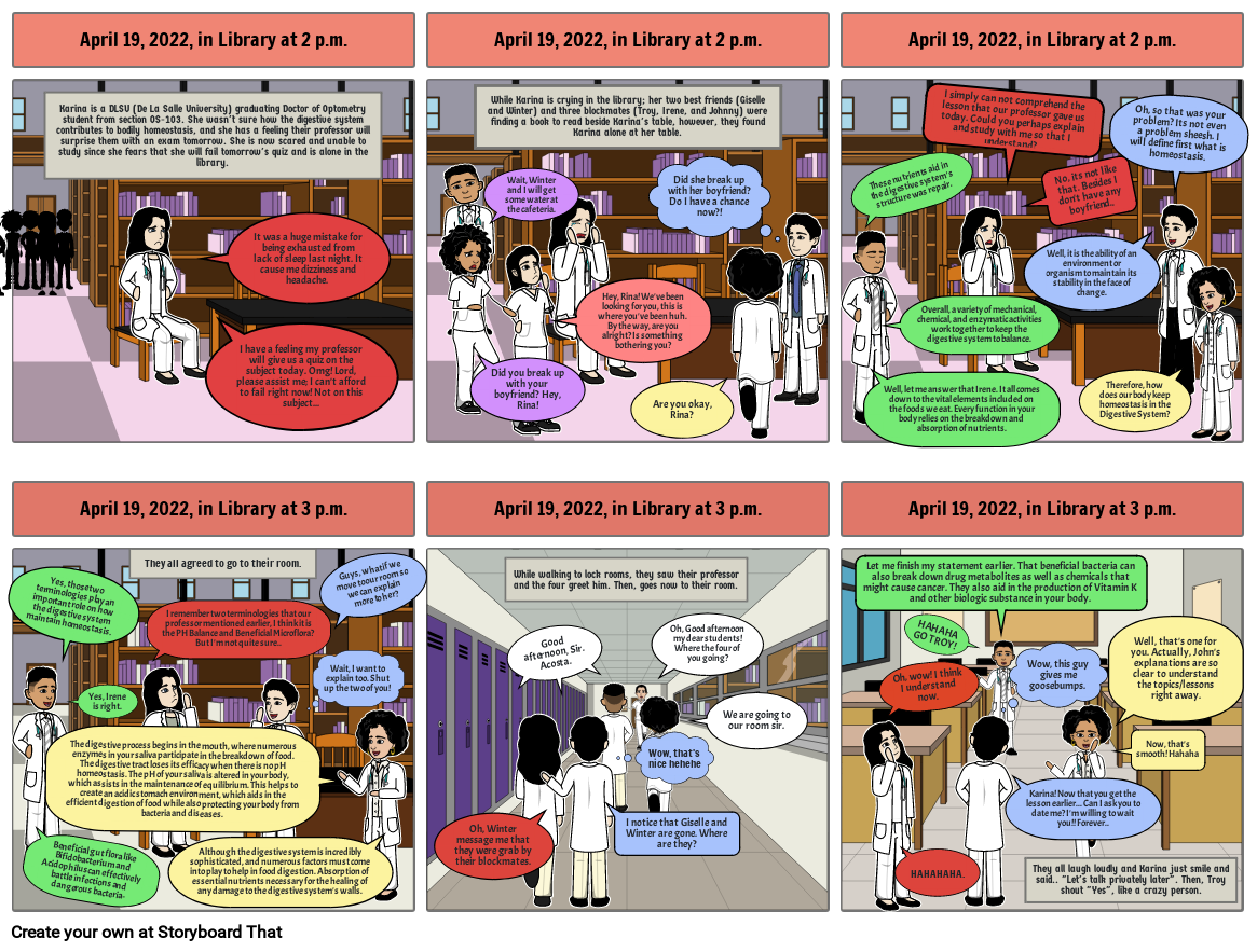 Karina is a DLSU (De La Salle University) graduating Doctor of Optometry student from section OS-103. She wasn't sure how the digestive system contributes to bodily homeostasis, and she has a feeling their professor will surprise them with an exam tomorrow. She is now scared and unable to study since she fears that she will fail tomorrow's quiz and is alone in the library.