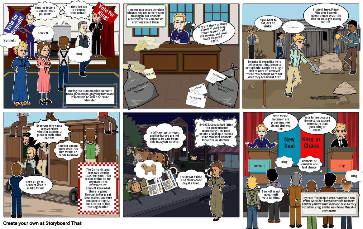 The On-to-Ottawa Trek was born in 1935. Workers tried to ride trains all the way from BC to Ottawa to let Bennett know what they are going through in the great Depression, but were stopped in Regina and started to riot, the Regina Riot.