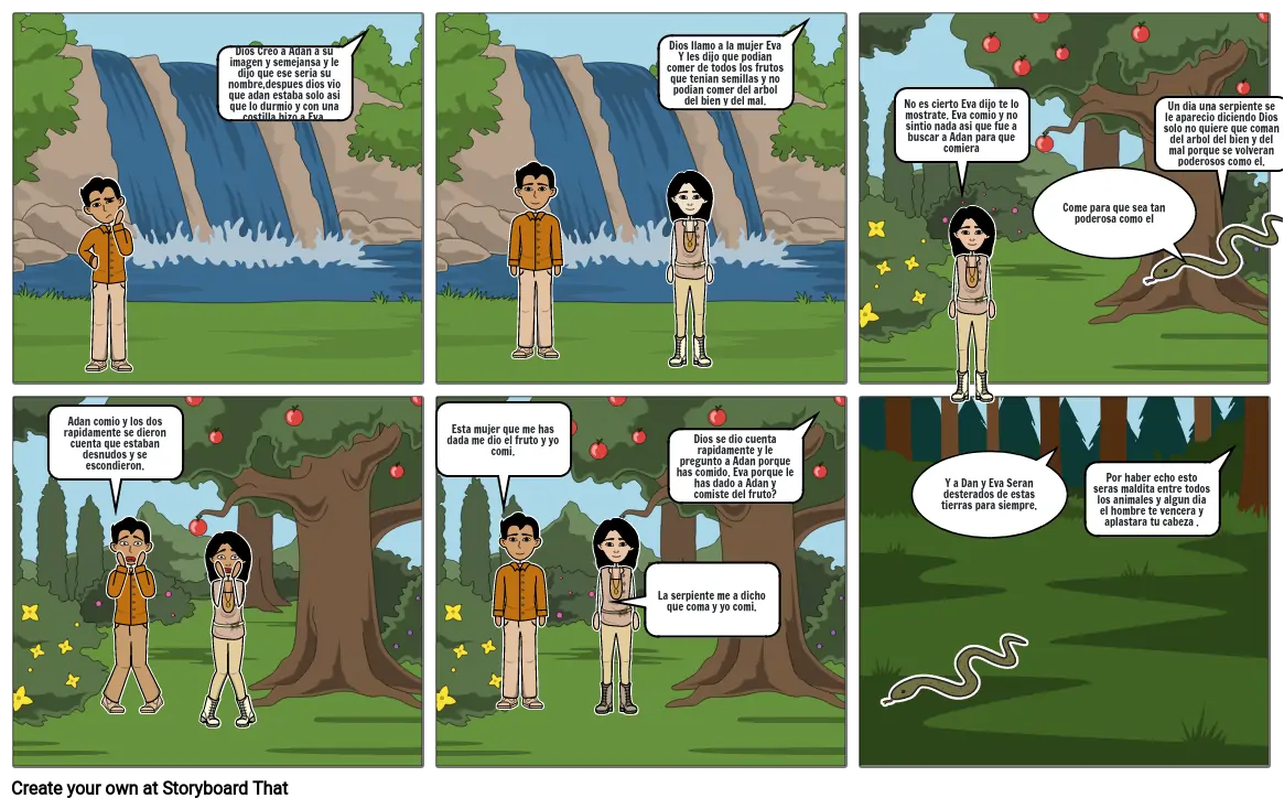 Un dia una serpiente se le aparecio diciendo Dios solo no quiere que coman del arbol del bien y del mal porque se volveran poderosos como el.
