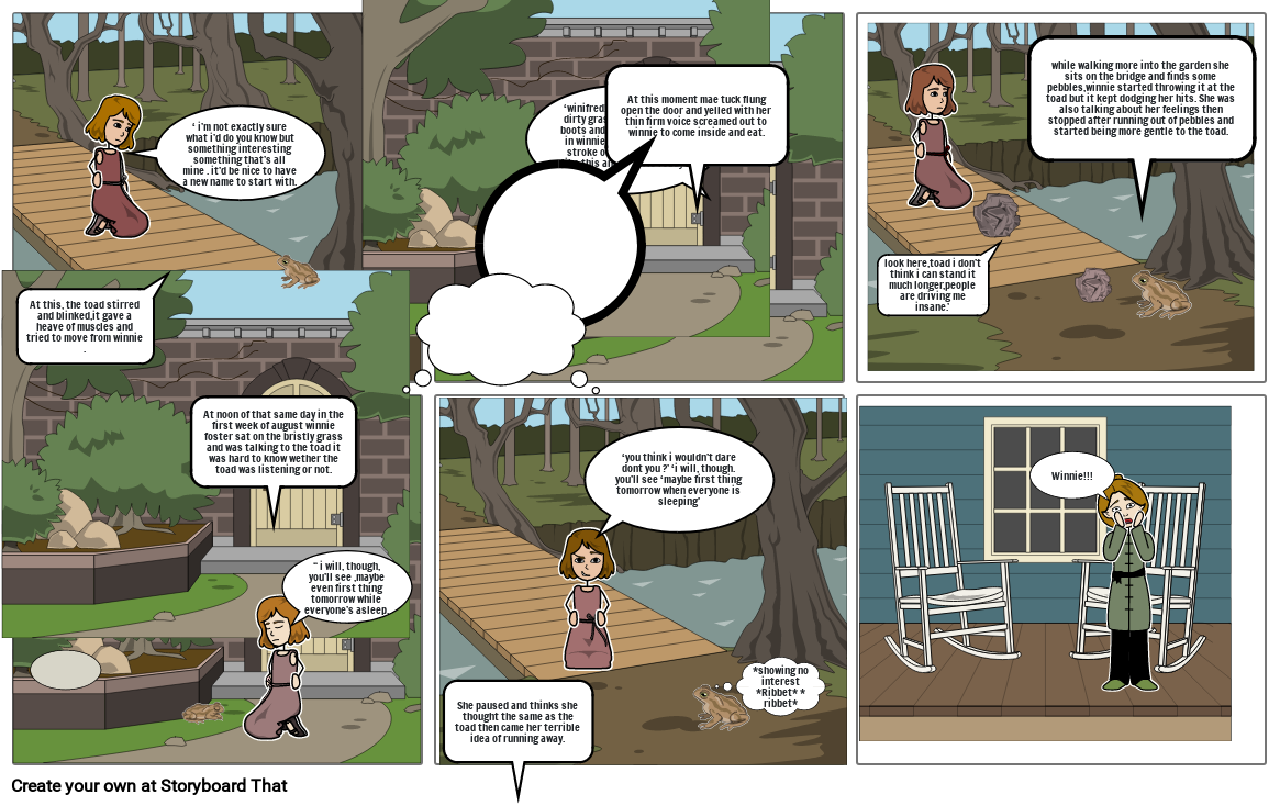 At noon of that same day in the first week of august winnie foster sat on the bristly grass and was talking to the toad it was hard to know wether the toad was listening or not.