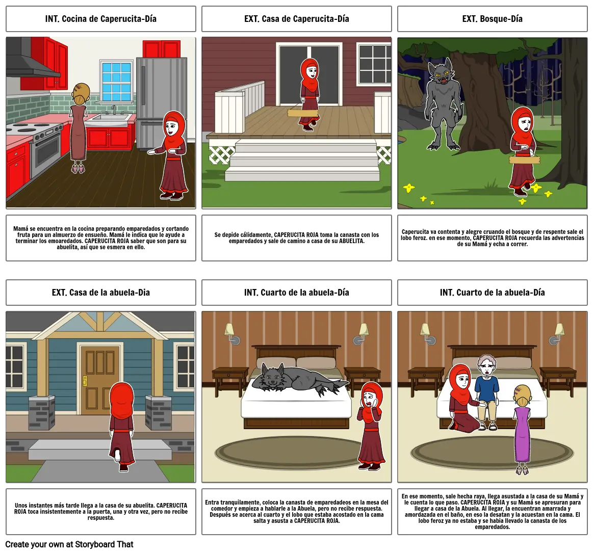 En ese momento, sale hecha raya, llega asustada a la casa de su Mamá y le cuenta lo que paso. CAPERUCITA ROJA y su Mamá se apresuran para llegar a casa de la Abuela. Al llegar, la encuentran amarrada y amordazada en el baño, en eso la desatan y la acuestan en la cama. El lobo feroz ya no estaba y se habia llevado la canasta de los emparedados.