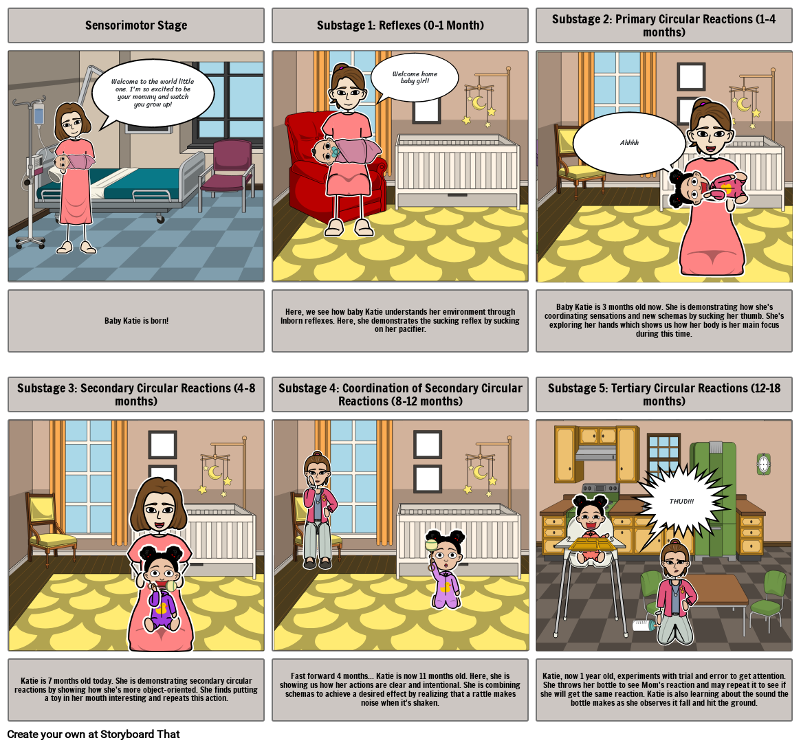 Katie, now 1 year old, experiments with trial and error to get attention. She throws her bottle to see Mom's reaction and may repeat it to see if she will get the same reaction. Katie is also learning about the sound the bottle makes as she observes it fall and hit the ground.