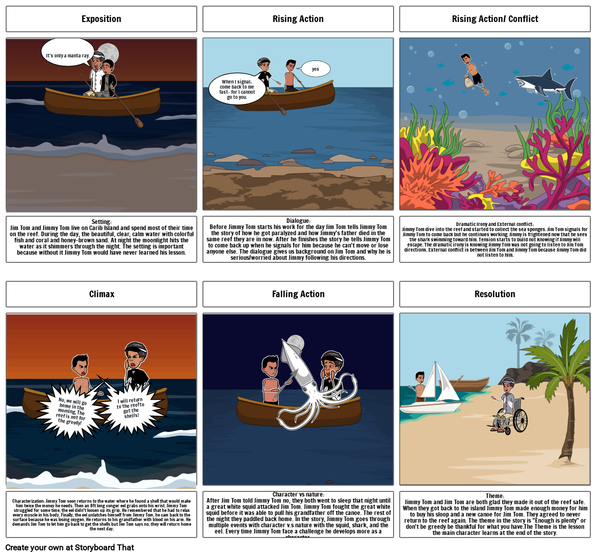Dramatic Irony and External conflict:Jimmy Tom dive into the reef and started to collect the sea sponges. Jim Tom signals for Jimmy Tom to come back but he continues working. Jimmy is frightened now that he sees the shark swimming toward him. Tension starts to build not knowing if Jimmy will escape. The dramatic irony is knowing Jimmy Tom was not going to listen to Jim Tom directions. External conflict is between Jim and Jimmy because Jimmy did not listen to him.