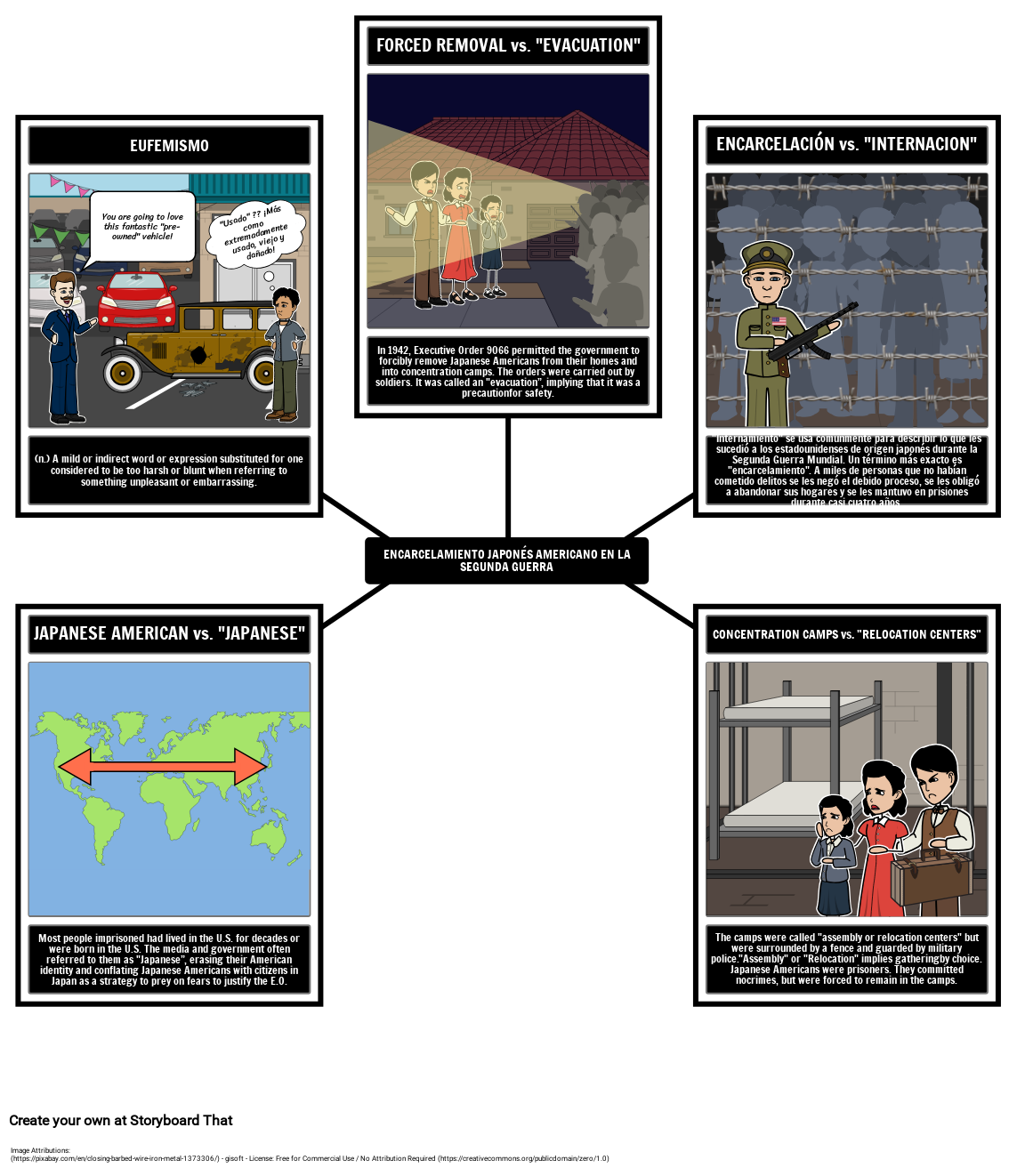 Es útil para los estudiantes obtener una vista previa del vocabulario y los términos importantes cuando estudian eventos históricos para ayudar a darles contexto. Este guión gráfico también se centra en los eufemismos empleados por el gobierno de los EE. UU. Y los medios de comunicación para describir el encarcelamiento de japoneses estadounidenses durante la Segunda Guerra Mundial, alentando a los estudiantes a analizar la importancia de las palabras para describir con precisión eventos históricos.