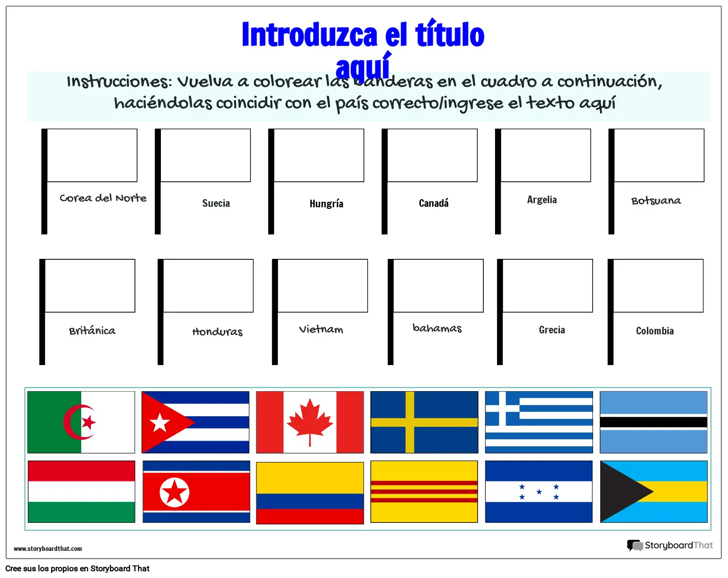 Instrucciones: Vuelva a colorear las banderas en el cuadro a continuación, haciéndolas coincidir con el país correcto/ingrese el texto aquí