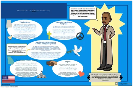 Marcha sobre Washington y Selma a Montgomery marzo En 1963, Lewis se convirtió en presidente de SNCC (Comité Coordinador Estudiantil No Violento). Se unió a otros líderes de derechos civiles como Martin Luther King, Jr. como uno de los "Seis Grandes" y planeó la Marcha en Washington. ¡John Lewis fue el orador más joven del evento! Para protestar por el hecho de que a los afroamericanos se les negaba sistemáticamente el derecho al voto, Lewis encabezó una marcha desde Selma hasta Montgomery, Alabama, el 7 de marzo de 1965. Al cruzar el puente Pettus, fueron brutalmente atacados por la policía. Lewis sufrió una fractura de cráneo y pensó que podría morir. Esto se llamó "Domingo Sangriento". Ayudó a convencer al público para que apoyara la aprobación de la Ley de Derechos Electorales en 1965.