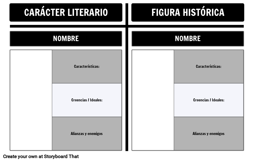 Plantilla de T-Chart de personajes alegóricos: use esta plantilla para comparar personajes literarios con personajes históricos.