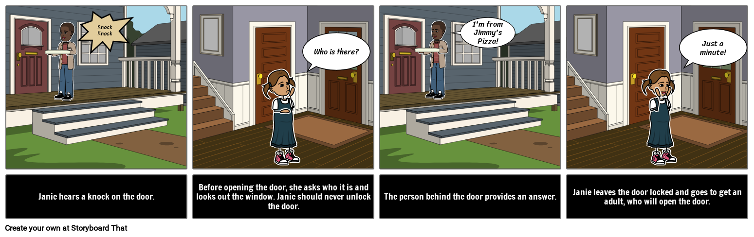 Before opening the door, she asks who it is and looks out the window. Janie should never unlock the door.