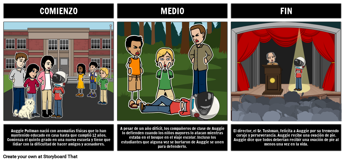 El director, el Sr. Tushman, felicita a Auggie por su tremendo coraje y perseverancia. Auggie recibe una ovación de pie. Auggie dice que todos deberían recibir una ovación de pie al menos una vez en la vida.