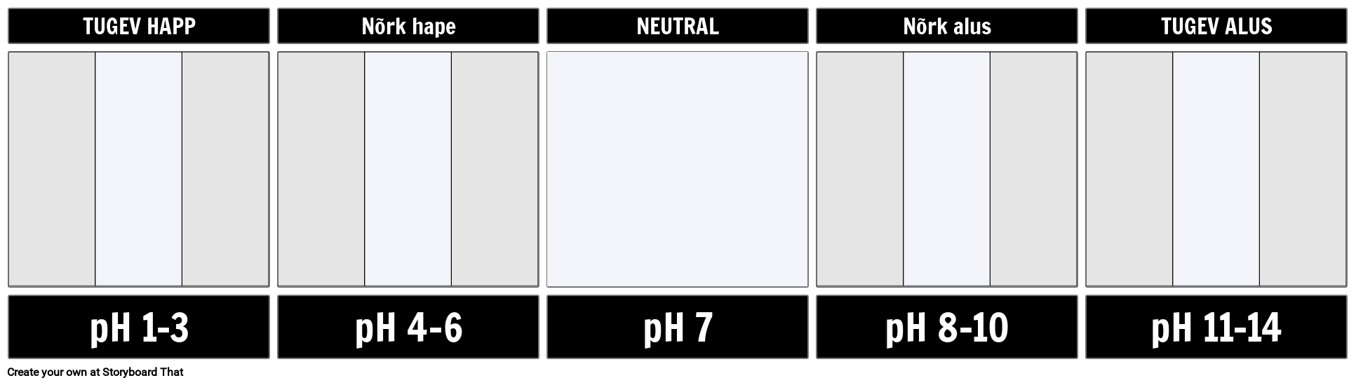 pH skaala mall | Paluge õpilastel muuta tausta värvi vastavalt pH skaalale. Seejärel lisage näited üksustest / ainetest, mis sobivad igasse lahtrisse.