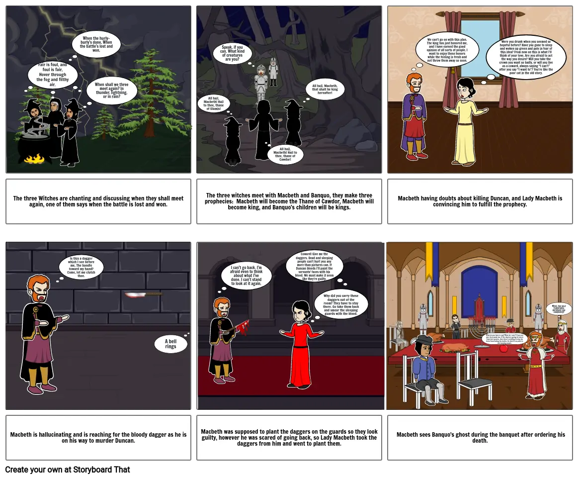 The three witches meet with Macbeth and Banquo, they make three prophecies: Macbeth will become the Thane of Cawdor, Macbeth will become king, and Banquo’s children will be kings.
