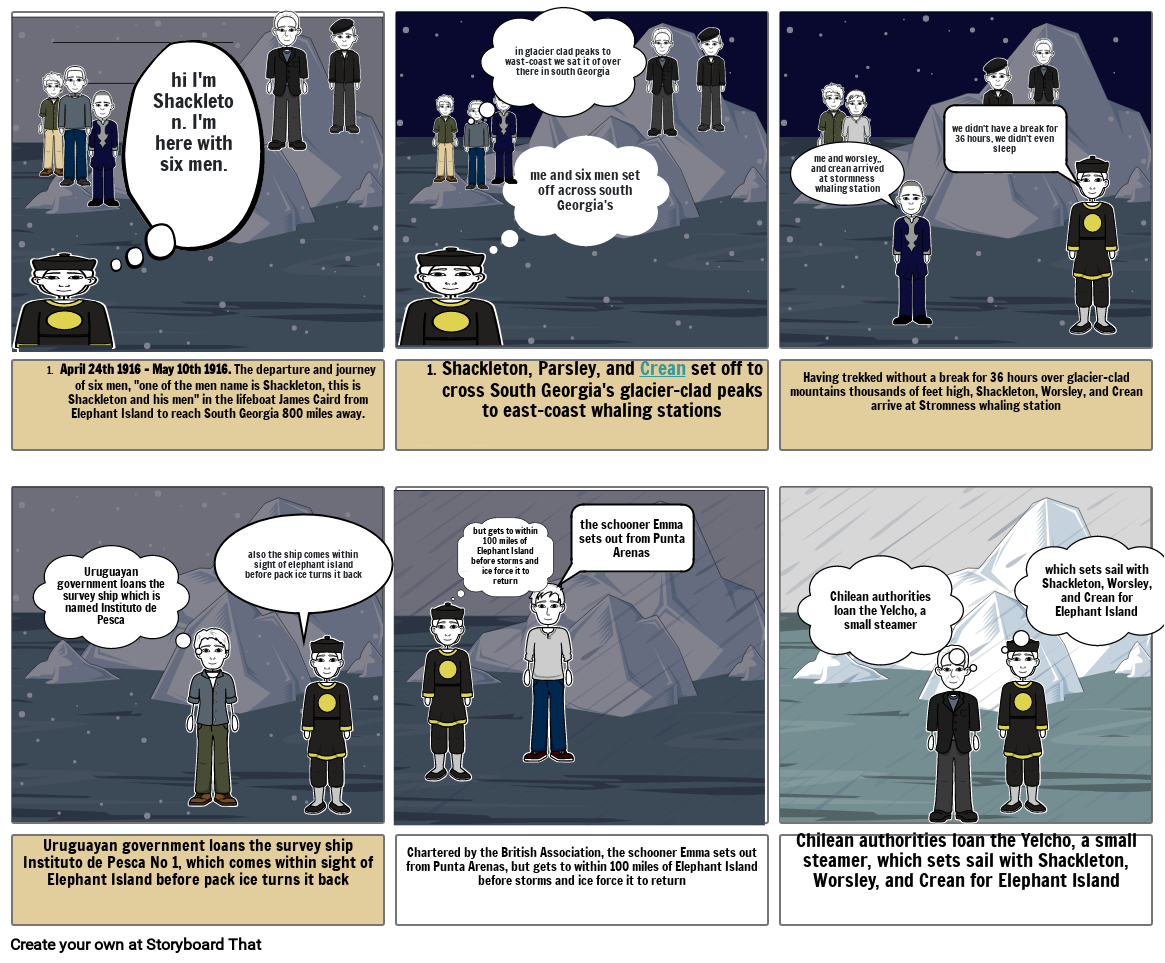 April 24th 1916 - May 10th 1916. The departure and journey of six men, "one of the men name is Shackleton, this is Shackleton and his men" in the lifeboat James Caird from Elephant Island to reach South Georgia 800 miles away.