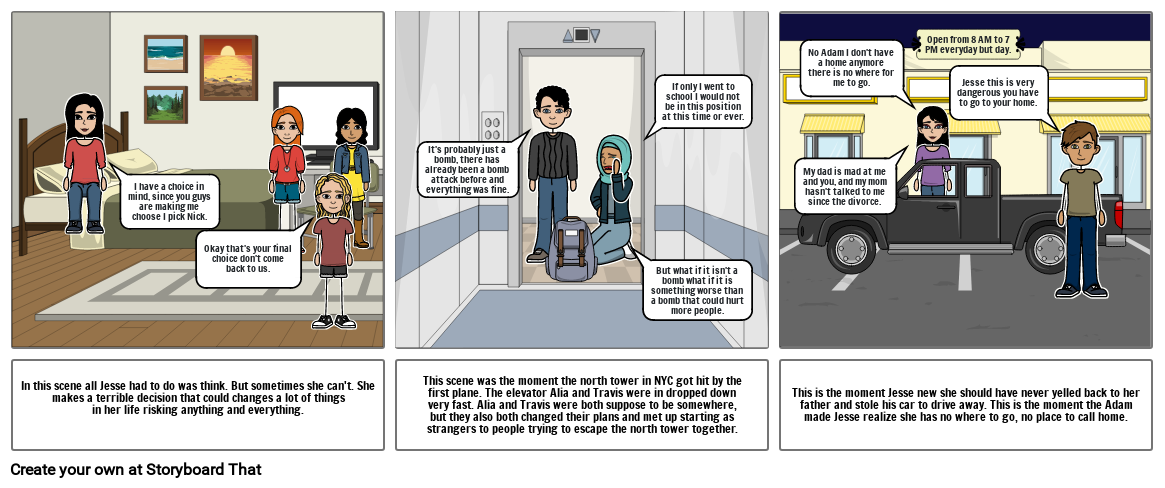 This scene was the moment the north tower in NYC got hit by the first plane. The elevator Alia and Travis were in dropped down very fast. Alia and Travis were both suppose to be somewhere,but they also both changed their plans and met up starting as strangers to people trying to escape the north tower together.