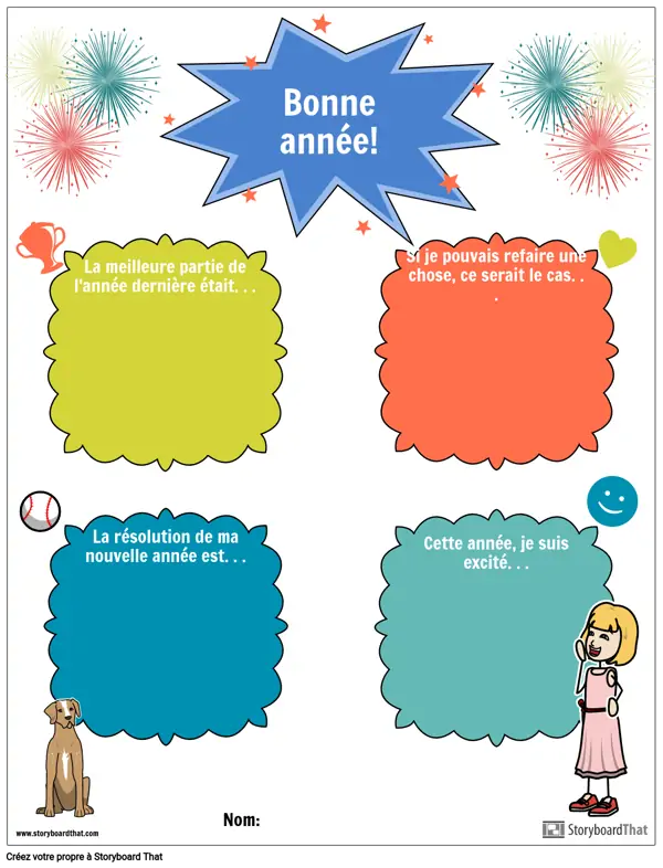 Les élèves termineront les phrases de début de chaque case pour réfléchir à l'année dernière et créer des objectifs pour l'année à venir. Ensuite, ils remplaceront le caractère et les symboles par un caractère, des objets et des symboles qui les reflètent.