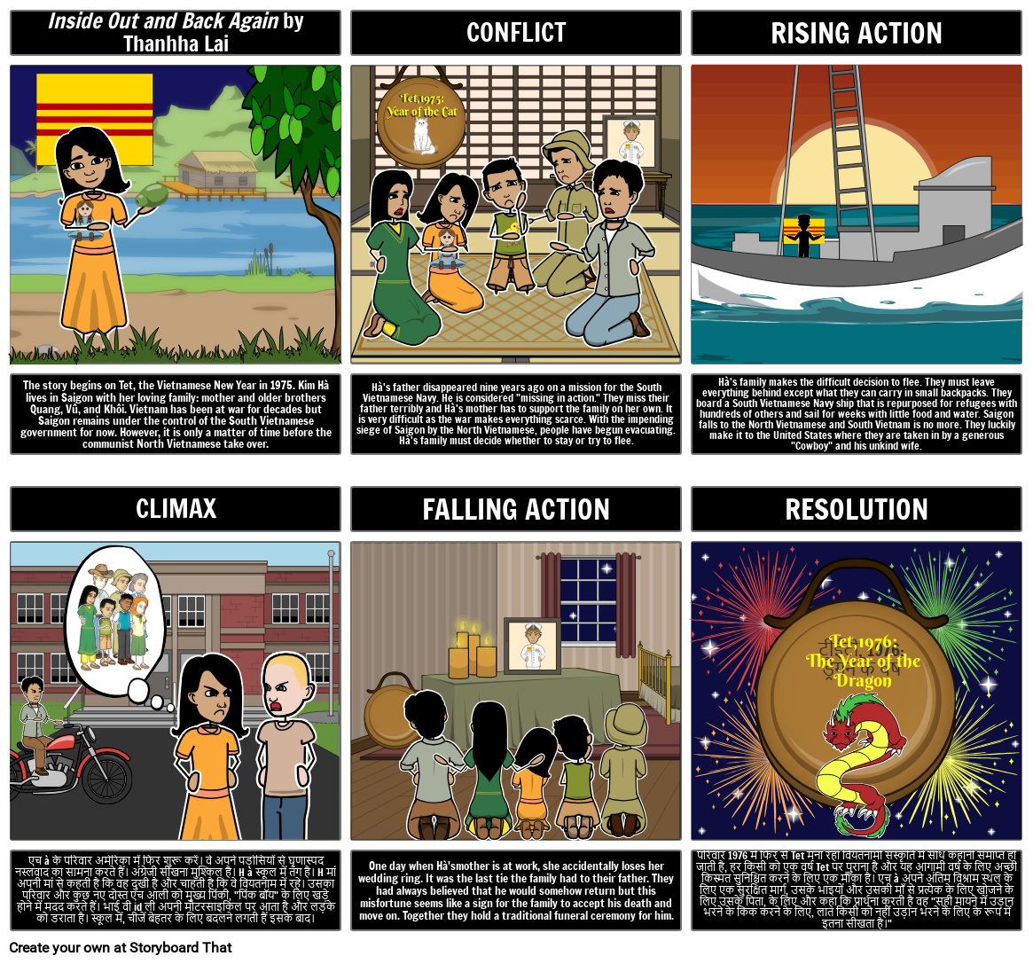 छात्र 6 सेल स्टोरीबोर्ड में कहानी के कथानक को संक्षेप और चित्रण कर सकते हैं, जिसमें प्रदर्शनी और संघर्ष, बढ़ती कार्रवाई, चरमोत्कर्ष / मोड़, गिरती कार्रवाई और संकल्प पर प्रकाश डाला गया है।