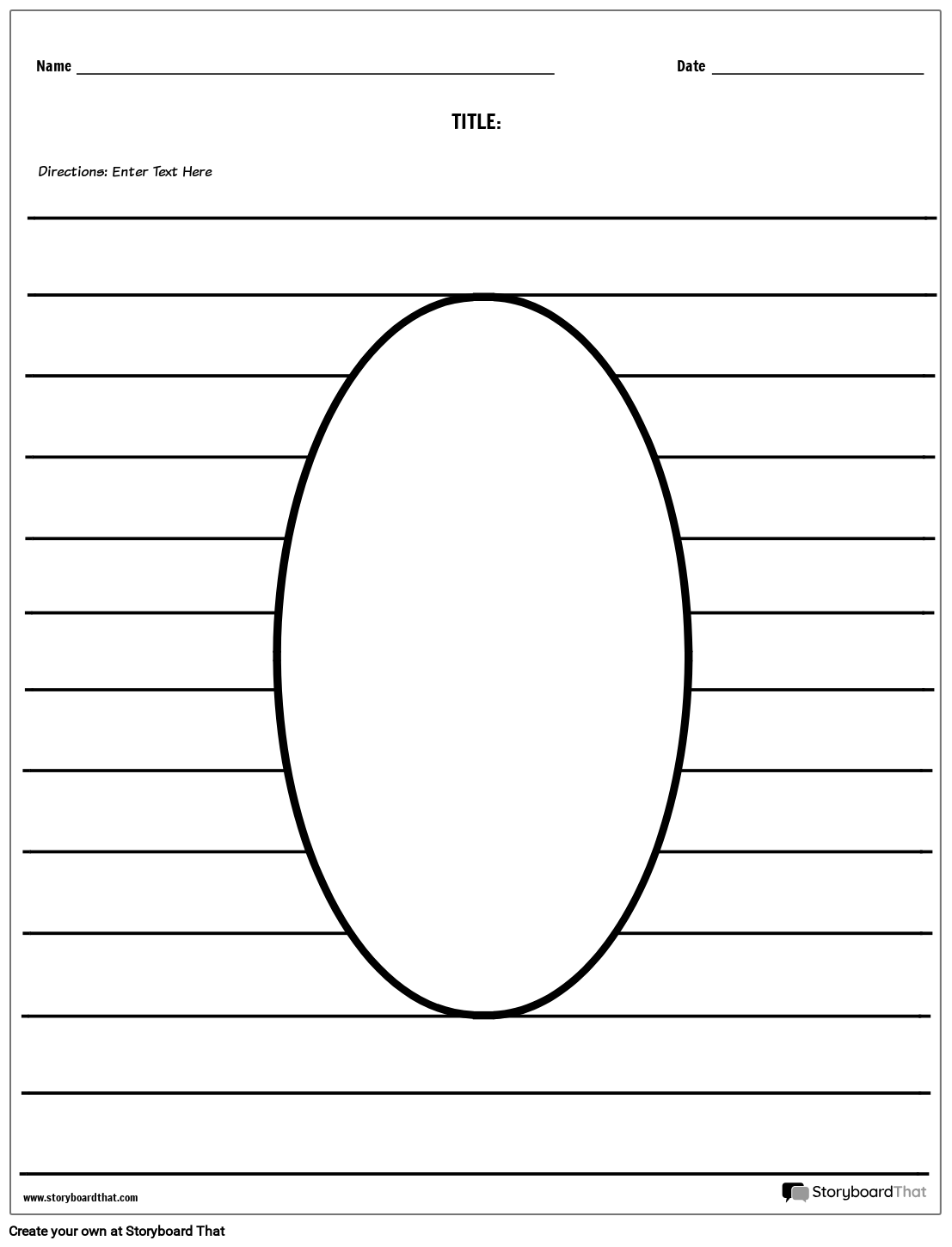 इलस्ट्रेटेड स्टोरी वर्कशीट टेम्प्लेट जिसमें केंद्र में एक अंडाकार फ्रेम और लिखने के लिए चौड़ी दूरी वाली लाइनें हैं। छात्रों से कहानियां लिखने और चित्र बनाने के लिए कहें!