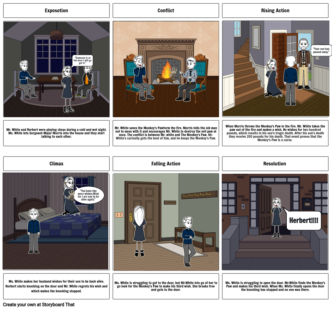 Ms. White makes her husband wishes for their son to be back alive. Herbert starts knocking on the door and Mr. White regrets his wish and which makes the knocking stopped.