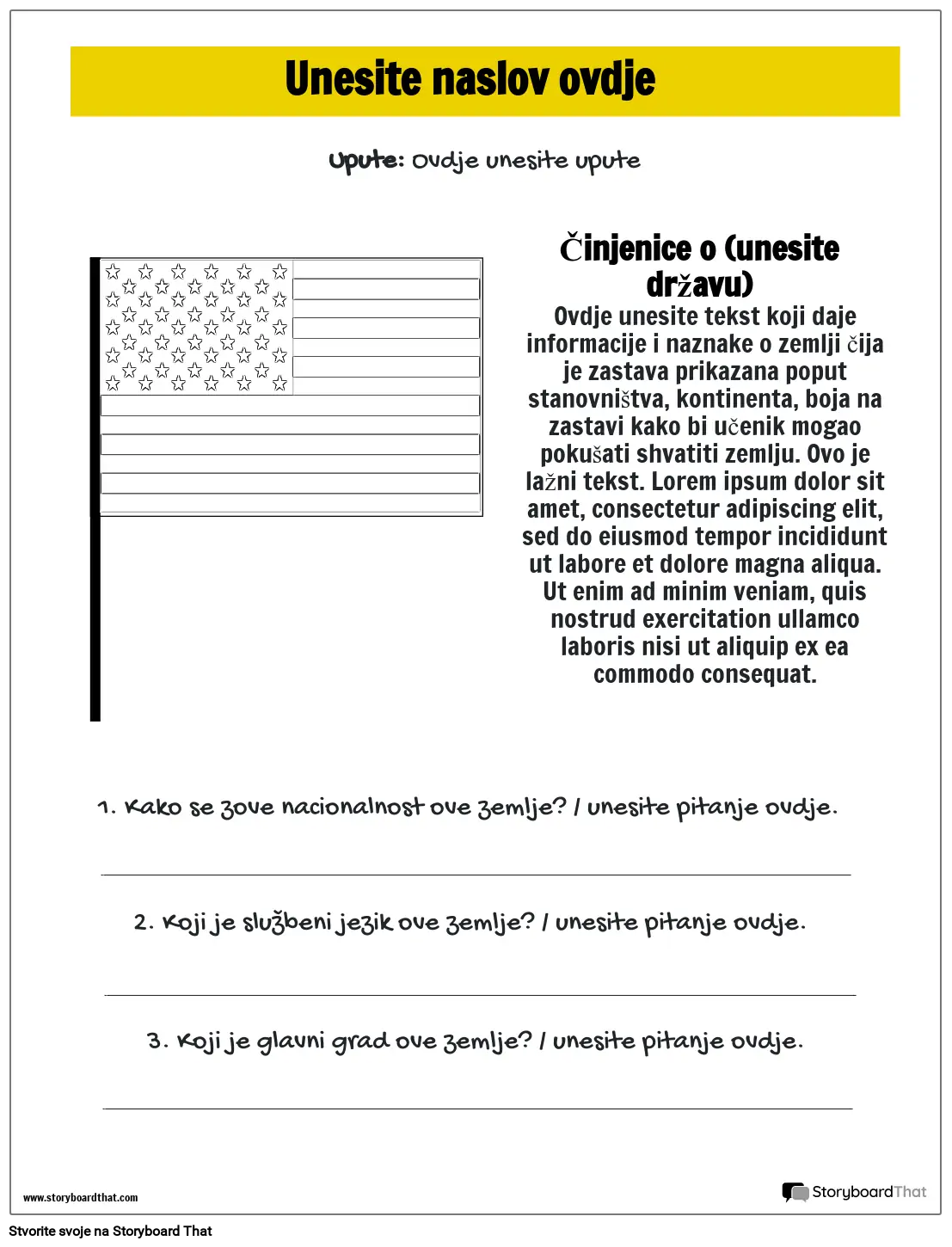 Ovdje unesite tekst koji daje informacije i naznake o zemlji čija je zastava prikazana poput stanovništva, kontinenta, boja na zastavi kako bi učenik mogao pokušati shvatiti zemlju. Ovo je lažni tekst. Lorem ipsum dolor sit amet, consectetur adipiscing elit, sed do eiusmod tempor incididunt ut labore et dolore magna aliqua. Ut enim ad minim veniam, quis nostrud exercitation ullamco laboris nisi ut aliquip ex ea commodo consequat.