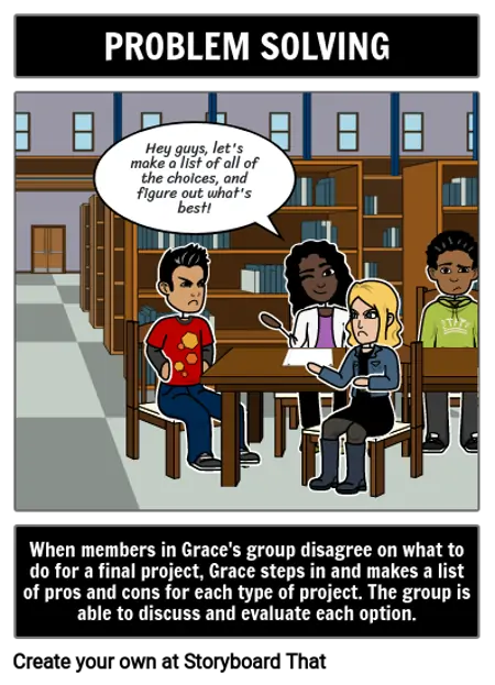 Whenmembers in Grace's group disagree on what to do for a final project, Grace steps in and makes a list of pros and cons for each type of project. The group is able to discuss and evaluate each option.