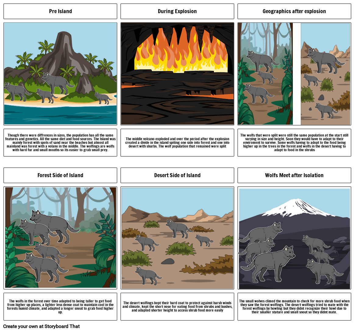 Though there were diffrences in sizes, the population has all the same features and genetics. All the same diet and food sources. The Island was mainly forest with spots of sand near the beaches but almost all mainland was forest with a volano in the middle. The wolfings are wolfs with hard fur and small mouths so its easier to grab small prey.