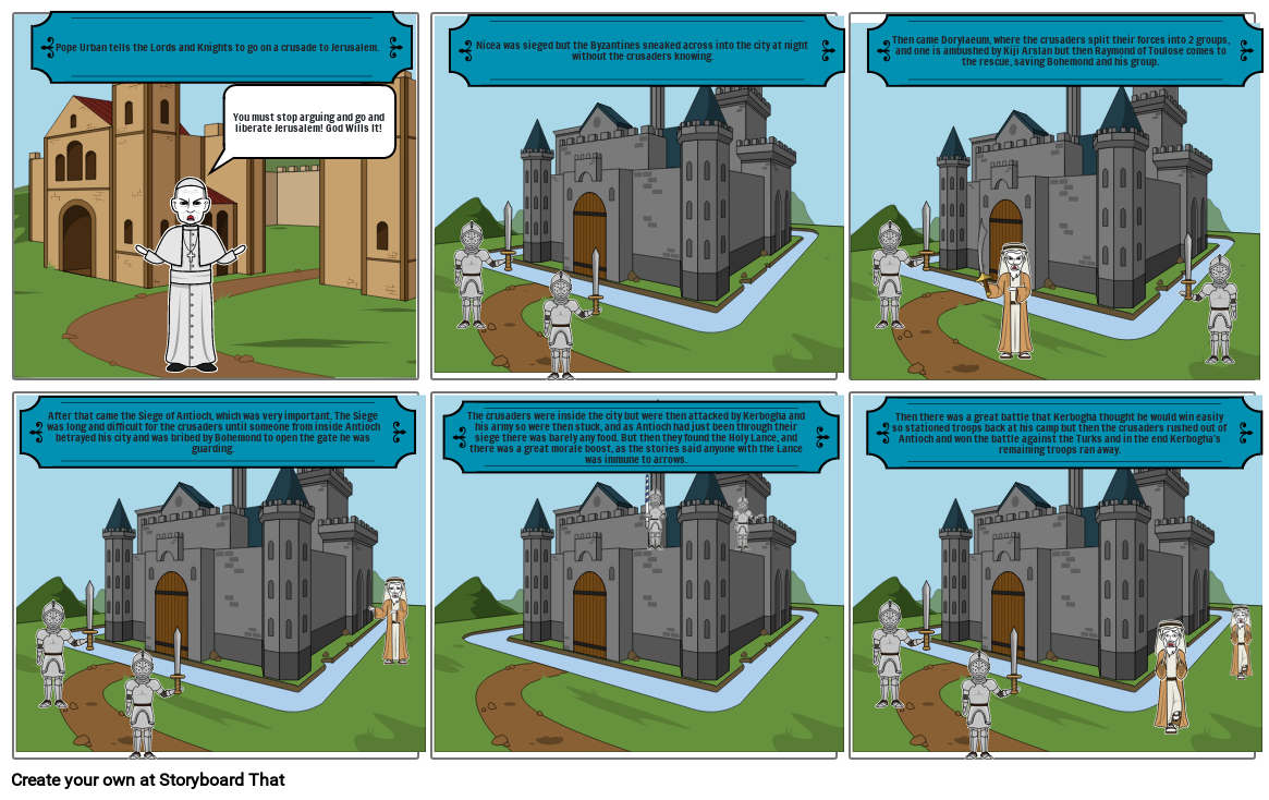 Then there was a great battle that Kerbogha thought he would win easily so stationed troops back at his camp but then the crusaders rushed out of Antioch and won the battle against the Turks and in the end Kerbogha's remaining troops ran away.