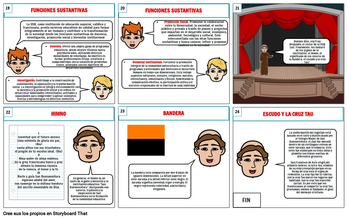 Buenos días, soy Fray Benjamín, el rector de la USB Cali. Finalmente, les hablaré de los signos de la institución: el himno, el significado de los colores de la bandera, el escudo y la cruz tau."