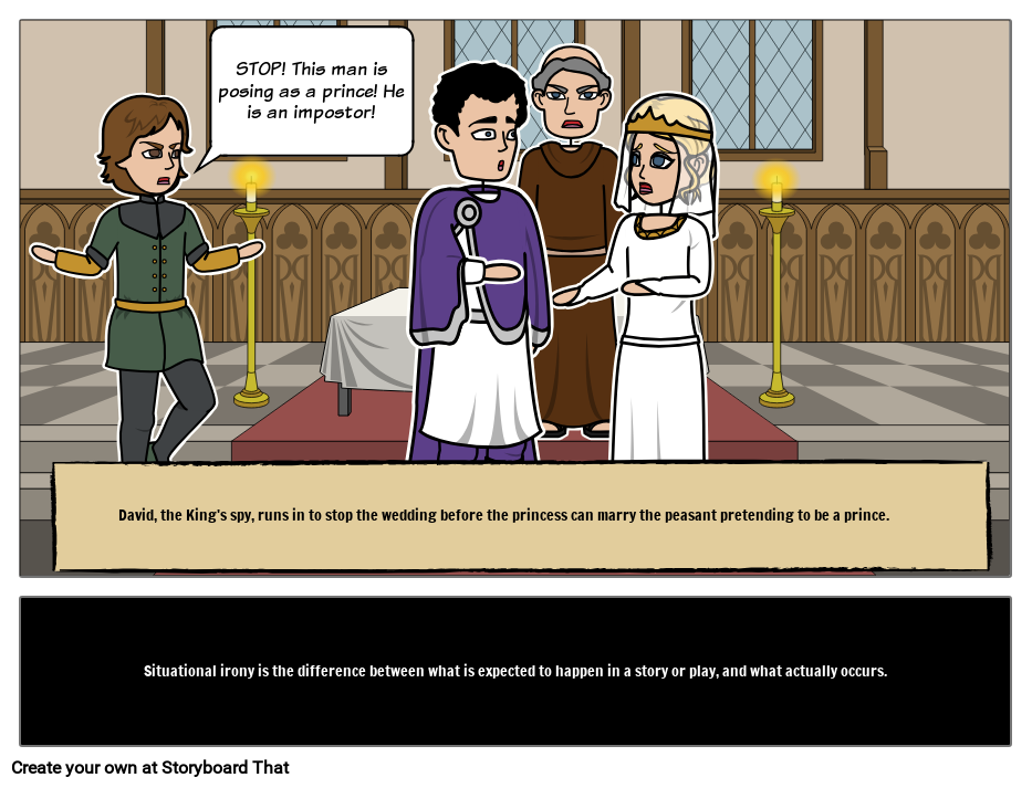 David, the King's spy, runs in to stop the wedding before the princess can marry the peasant pretending to be a prince.