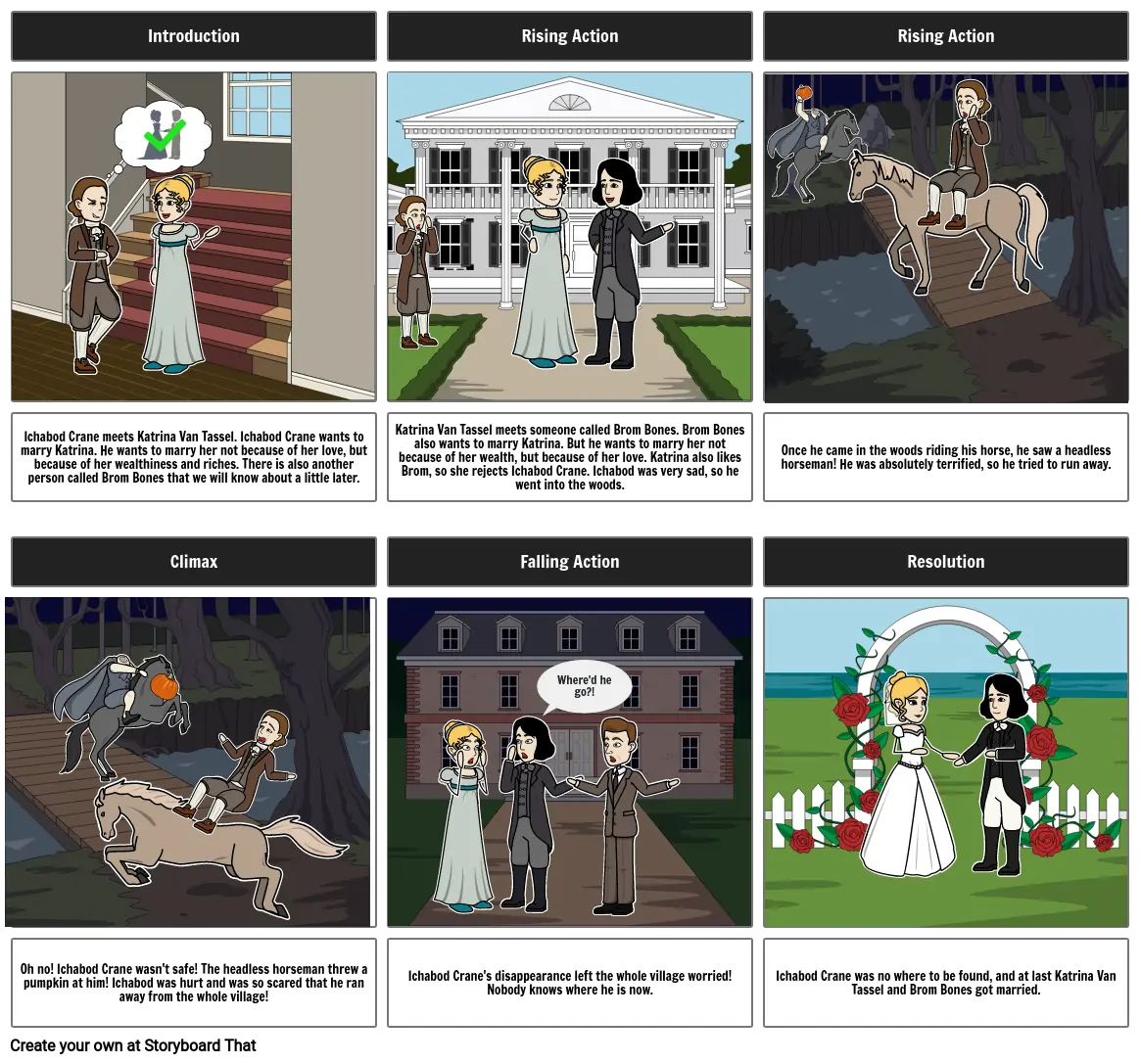 Katrina Van Tassel meets someone called Brom Bones. Brom Bones also wants to marry Katrina. But he wants to marry her not because of her wealth, but because of her love. Katrina also likes Brom, so she rejects Ichabod Crane. Ichabod was very sad, so he went into the woods.