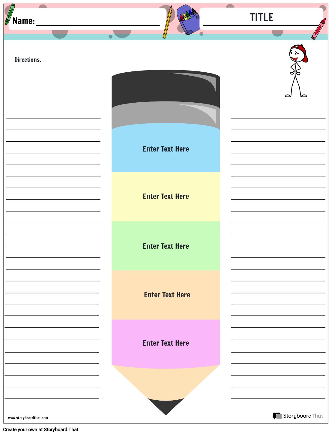 Kleurrijke potloodvormige grafische organizer met lijnen om te schrijven en ruimte voor tekst en afbeeldingen. Volledig klantgericht! Print in kleur of zwart-wit.