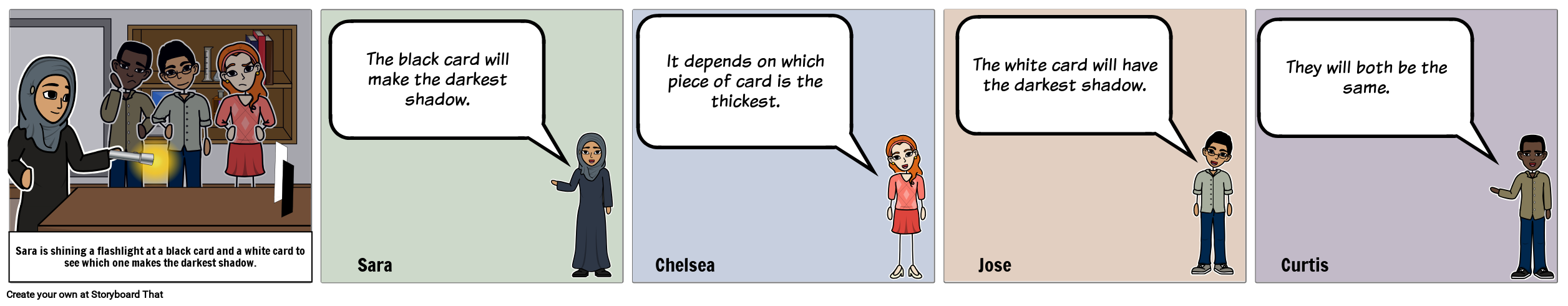 Sara is shining a flashlight at a black card and a white card to see which one makes the darkest shadow.