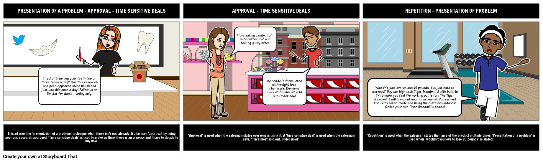 'Approval' is used when the salesman states everyone is using it. A 'time sensitive deal' is used when the salesman says, "I'm almost sold out. Order now!"