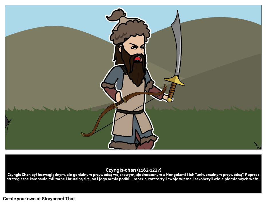 Czyngis-chan (1162-1227)Czyngis Chan był bezwzględnym, ale genialnym przywódcą wojskowym, zjednoczonym z Mongołami i ich "uniwersalnym przywódcą". Poprzez strategiczne kampanie militarne i brutalną siłę, on i jego armia podbili imperia, rozszerzyli swoje własne i zakończyli wiele plemiennych waśni.